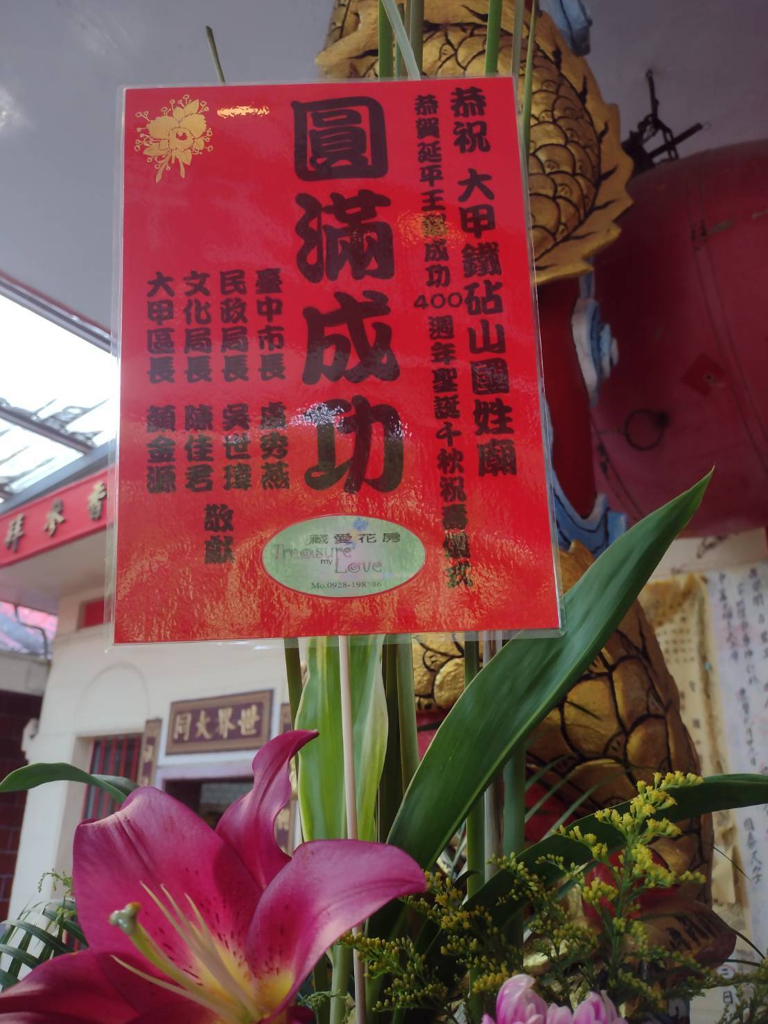 113年8月27日慶祝第十九任中天玉皇大天尊延平王鄭成功400週年聖誕千秋,市長盧秀燕親臨贈送(志延明祚)匾額留念實錄。