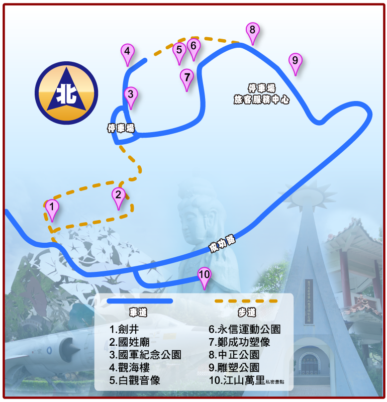 國姓廟四周花木扶疏,在此處歇腳,啜飲著廟方提供的麵包樹葉茶,每當清風徐來,更顯悠然自得,尤其浩瀚的台灣海峽、蜿蜓的溪流美景盡收眼底,誠浮生逍遙一大樂事。